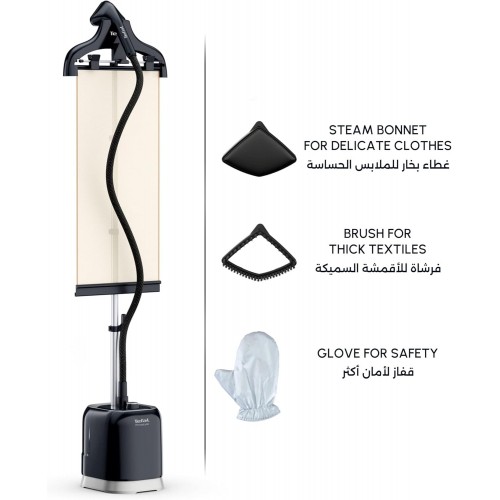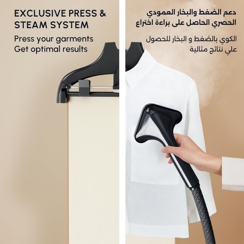 - Išskirtinis patentuotas vertikalus garinimas: vertikali atrama lengvam garinimui, suteikianti lygų paviršių drabužiui išlyginti ir laikančią jį vietoje garinant.