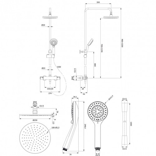- Stacionarios dušo galvos atstumas nuo sienos: 43 cm