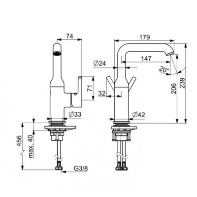 - Svirties/rankenėlės tipas Valdomas svirtele/rankenėle, Pieštuko formos svirtelė, Karšto/ šalto vandens simboliai