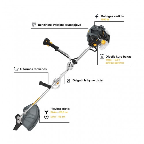 - Dvigubi laikymo diržai ir U formos rankenos leidžia tvirtai ir patogiai laikyti įrankį, todėl pjaunant mažiau pavargstama.