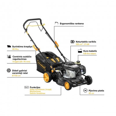 - Savaeigė vejapjovė su 125 cm³ darbinio tūrio keturtakčiu benzininiu Briggs&Stratton varikliu, pasižyminčiu patvarumu ir ilgaamžiškumu.