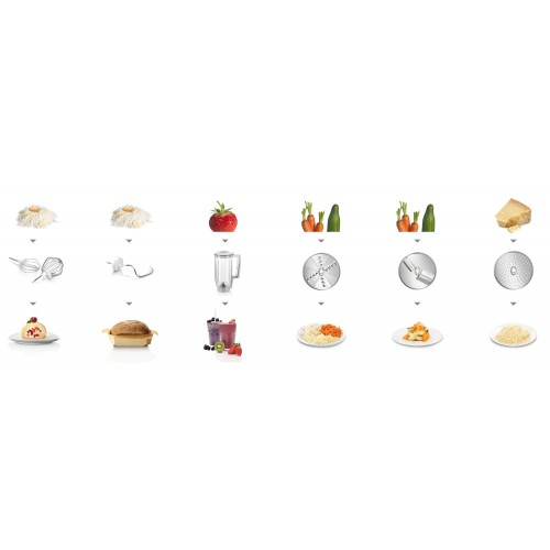 - Integruoti priedai 1 x dangtelis, 1 x nuolatinis smulkintuvas, 1 x nerūdijančio plieno maišymo dubuo, 1 x tešlos kablys, 1 x plastikinis maišymo dubuo, 1 x plastikinis maišytuvo priedas, 1 x stambios/smulkios trintuvės, 1 x smulkia tarka, 1 x plakiklis , 1 x plaktuvas, 1 x storas/plonas pjovimo diskas, 1 x priedų maišelis tamsiai pilkas